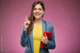 Smiling school teacher holding book and pointing finger. Isolated advertising portrait.