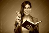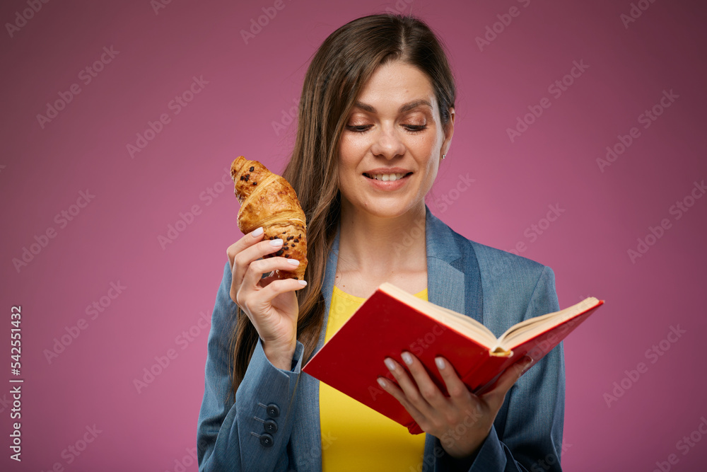 Woman eating croissant and reading book. Isolated advertising portrait.
