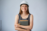 Smiling woman engineer in white construction hardhat holding book. Isolated female worker portrait.