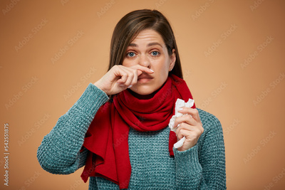 Woman with allergy or cold symptom runny nose usng tissue. isolated female portrait. Medicine advertising concept.