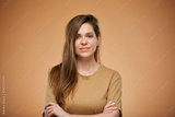 Smiling woman in brown casual home shirt. Isolated female portrait. Girl with long hair
