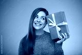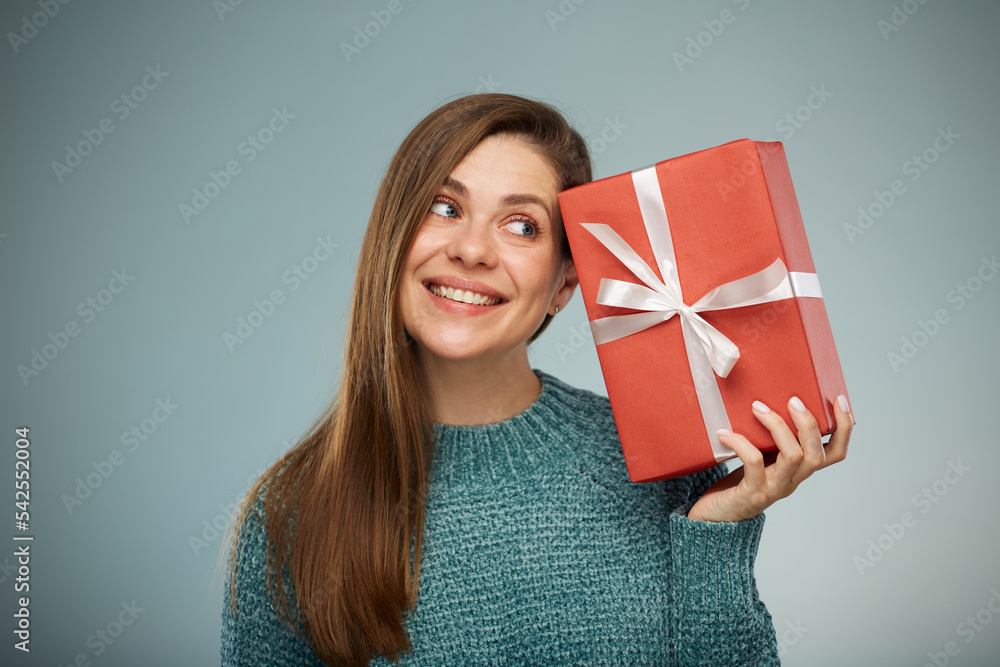 Happy smiling woman with red present looking away. Advertising female studio portrait.