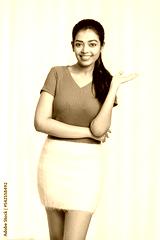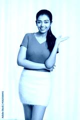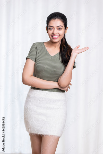 Pretty young woman greeting on white background.