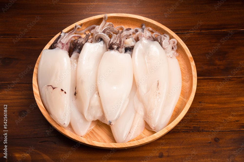Fresh Squid in wooden plate on wooden background, Fresh Splendid Squid on wooden plate.