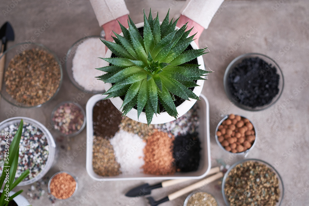 Woman holding planted Aloe Aristata Succulent Plant in white ceramic pot