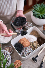 soil substrate preparation for transplanting houseplants on concrete background