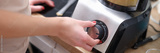 Woman adjusting speed of food processor closeup