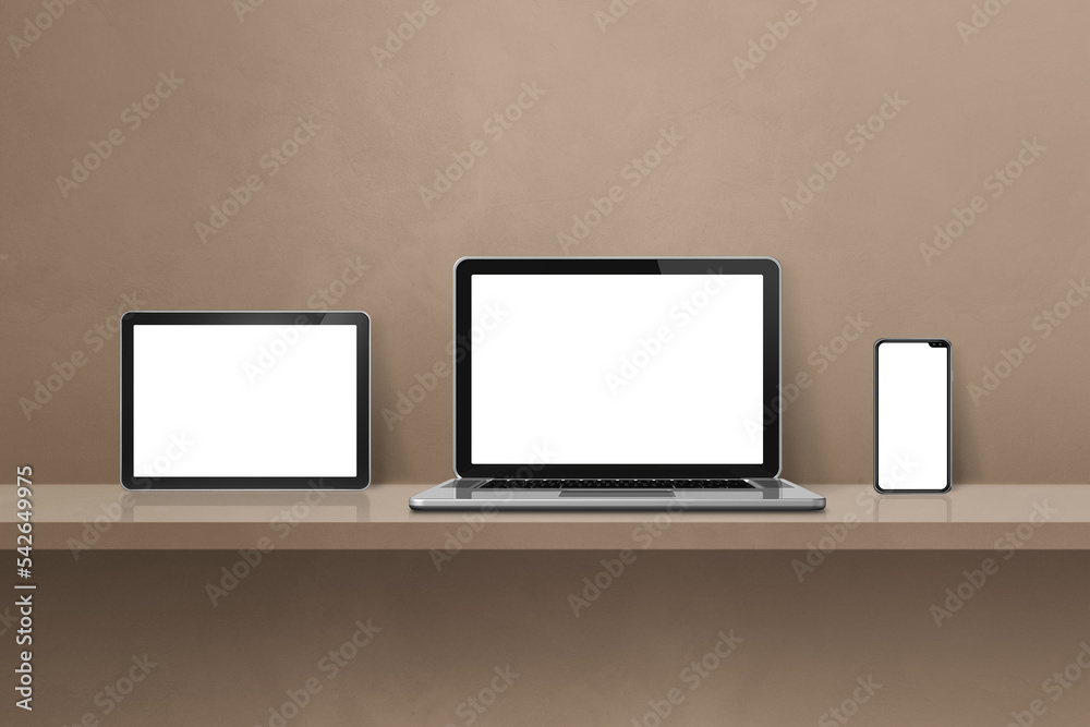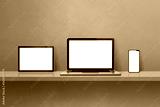 Laptop, mobile phone and digital tablet pc on brown wall shelf. Horizontal background