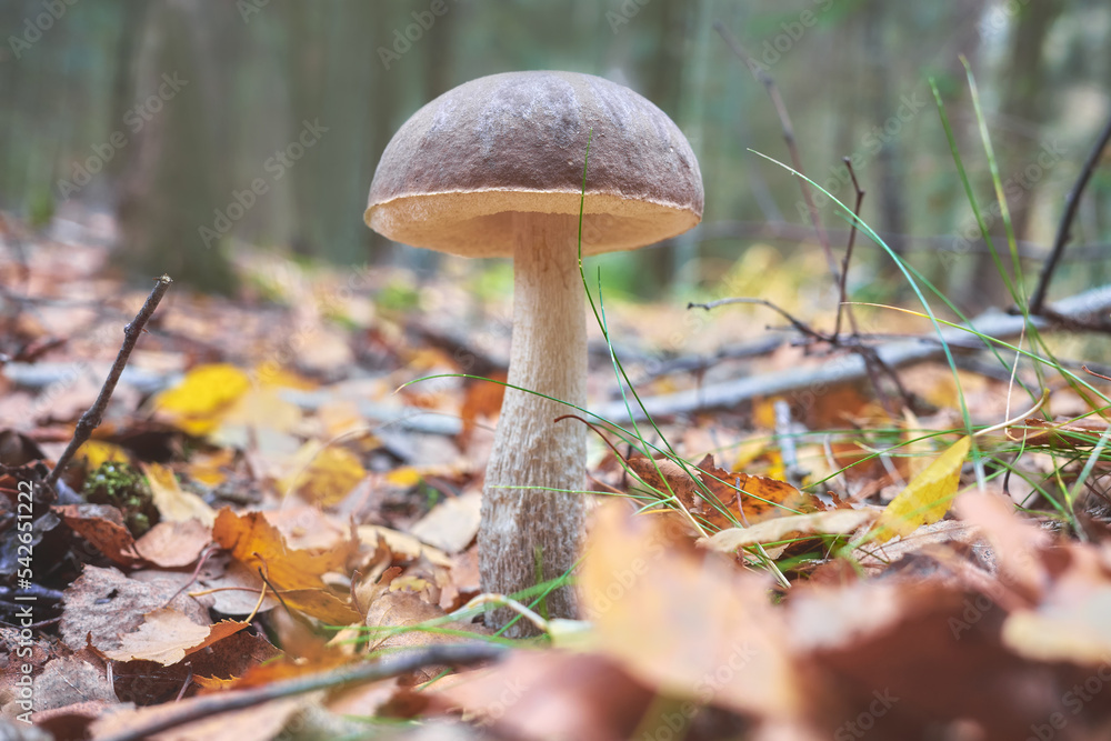 Close up picture of an edible mushroom in a forest, selective focus on the cap.