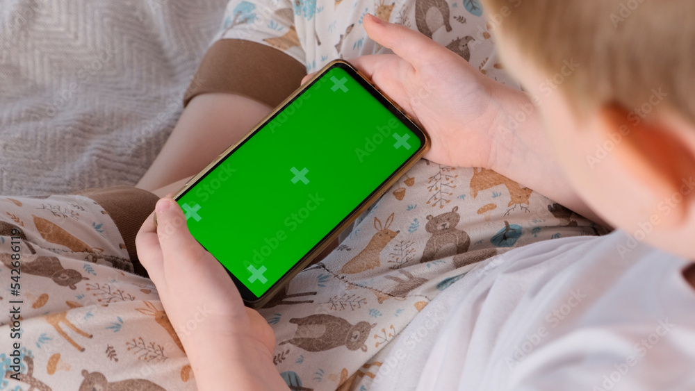 A child of primary school age uses a smartphone at home. Plays games, watches videos, scrolls through images. Green screen. Close-up