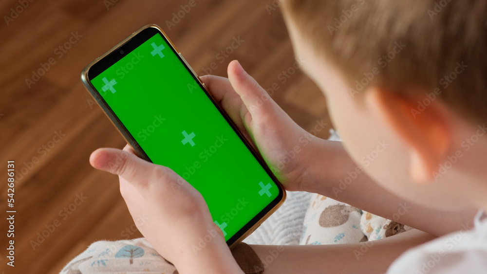 A child of primary school age uses a smartphone at home. Plays games, watches videos, scrolls through images. Green screen. Close-up