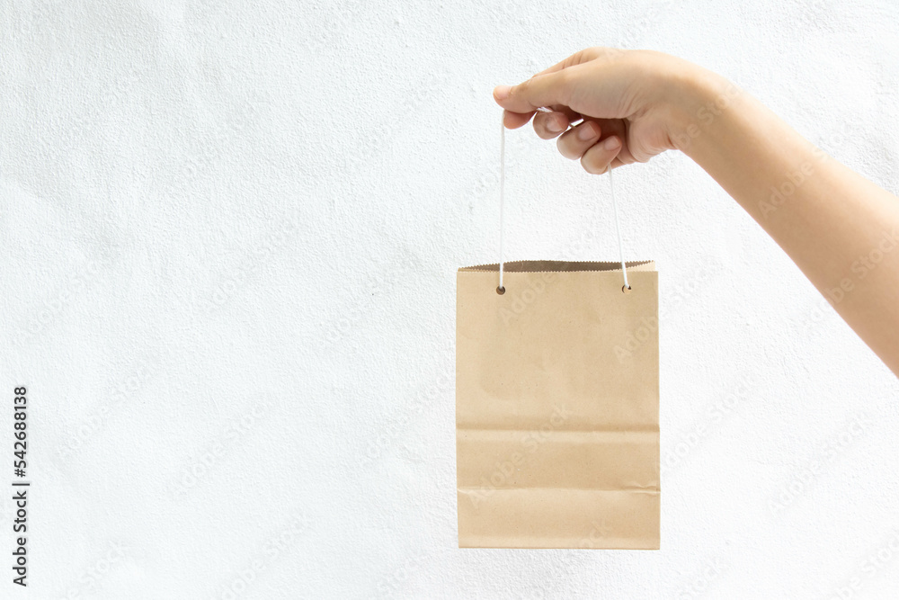 Hand of business woman hold brown paper shopping bag on white concrete background