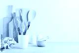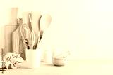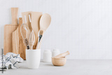 Kitchen utensils. Kitchen wooden tools and kitchenware. White modern kitchen interior background.