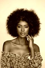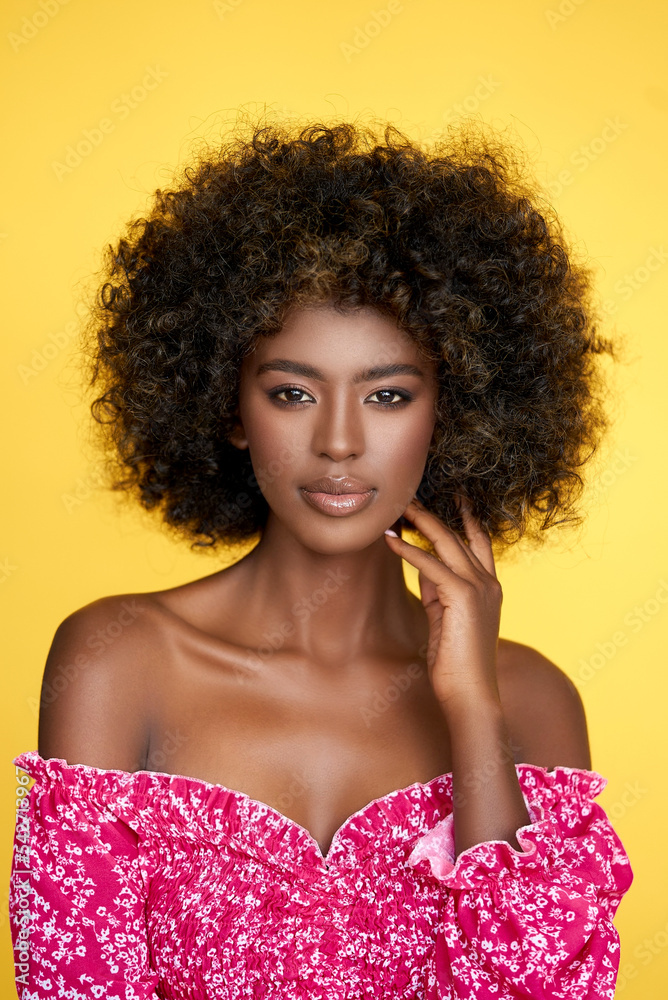 Smiling black woman in pink dress