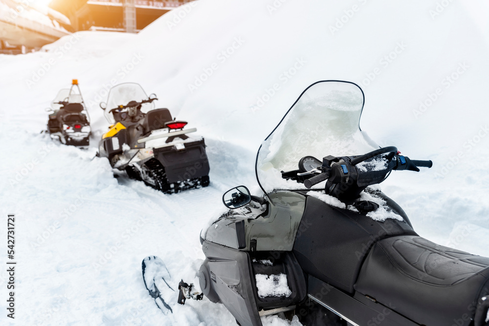 Back view scene many modern snow mobile scooter atv vehicle forest road against woods on cold snowy winter day. Snowmobile rental sport adventure trip service. Arctic nordic snow sledge transport