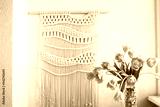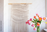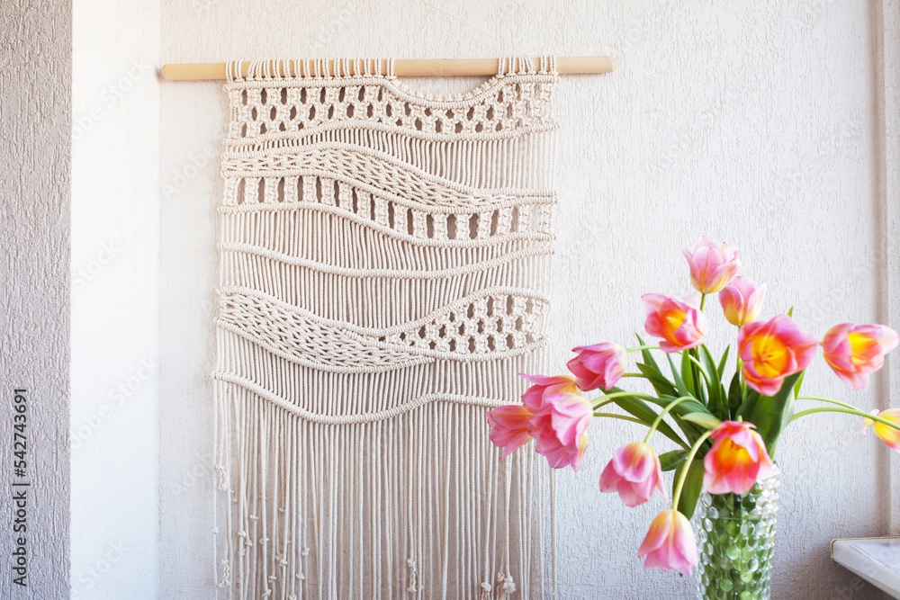 Stylish macrame wall hanging on the white wall above the chest of drawers. Cozy interior of living room with flowers in vase, macrame decor. Minimalistic concept of home decor.