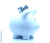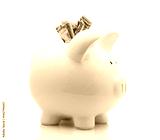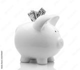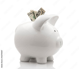 White piggy bank with money isolated on white background