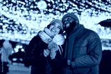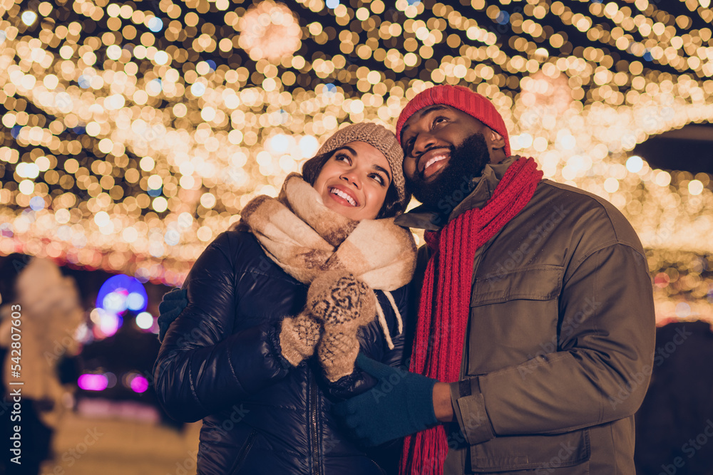 Photo of dreamy cute boyfriend girlfriend dressed winter season outfits looking noel x-mas decorations outdoors urban city street