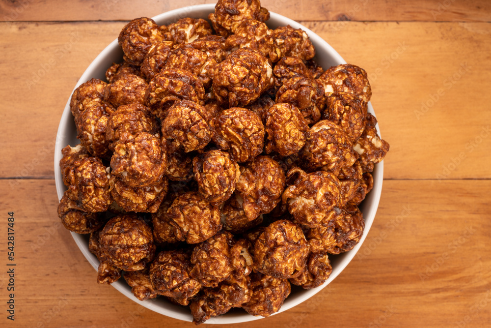 Chocolate Popcorn in white bowl on wooden background, Chocolate Mushroom Popcorn wooden background.
