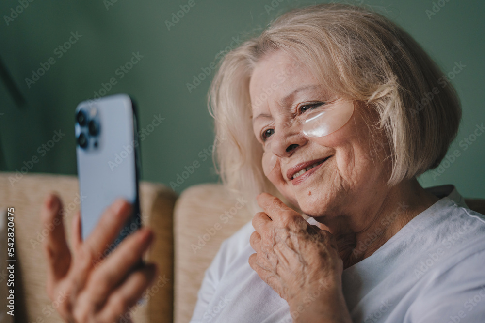 Beautiful senior woman applying eye patches for puffiness while using phone screen instead of a mirror to see how she looks. Beauty treatment. Happy lifestyle