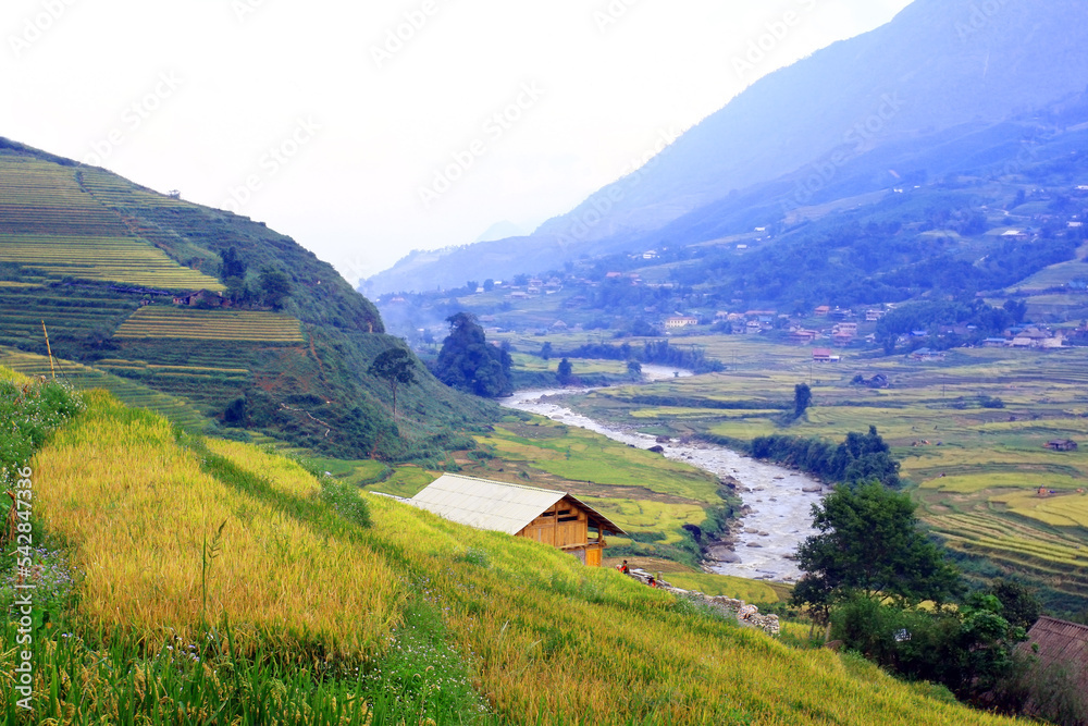 Terraced rice field and cottage in Sapa, Vietnam. The terraced rice paddy-fields in Sapa are the most beautiful ones in Vietnam