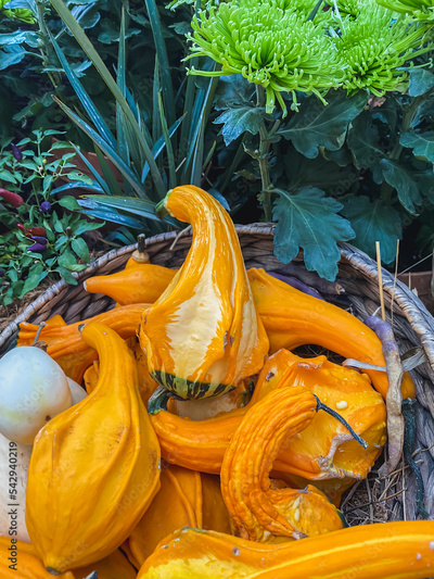 Basket with many different types of pumpkins. Harvest, Thanksgiving and Halloween celebrations.