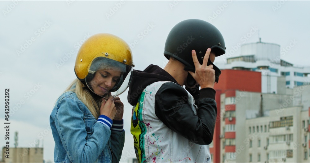 A young stylish couple of bikers sit on a bike standing in a public city parking. The guy and the girl put on motorcycle helmets. Love and safety