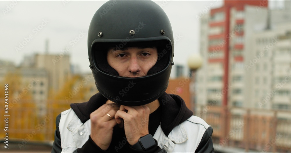 Close-up of Young man Wears black full Face Motorcycle Helmet Before Riding a Bike