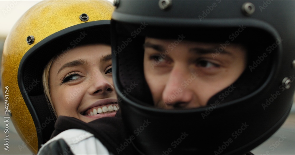 Close-up portrait of a young attractive girl sitting on a motorcycle behind her boyfriend. Couple in love in helmets on a bike