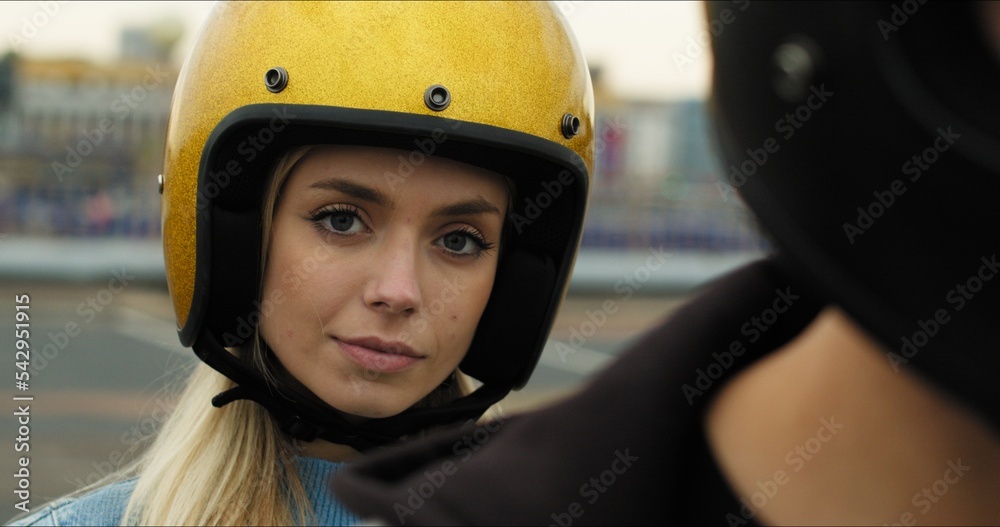 Close-up portrait of a young attractive girl sitting on a motorcycle behind her boyfriend. Couple in love in helmets on a bike