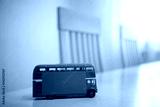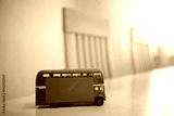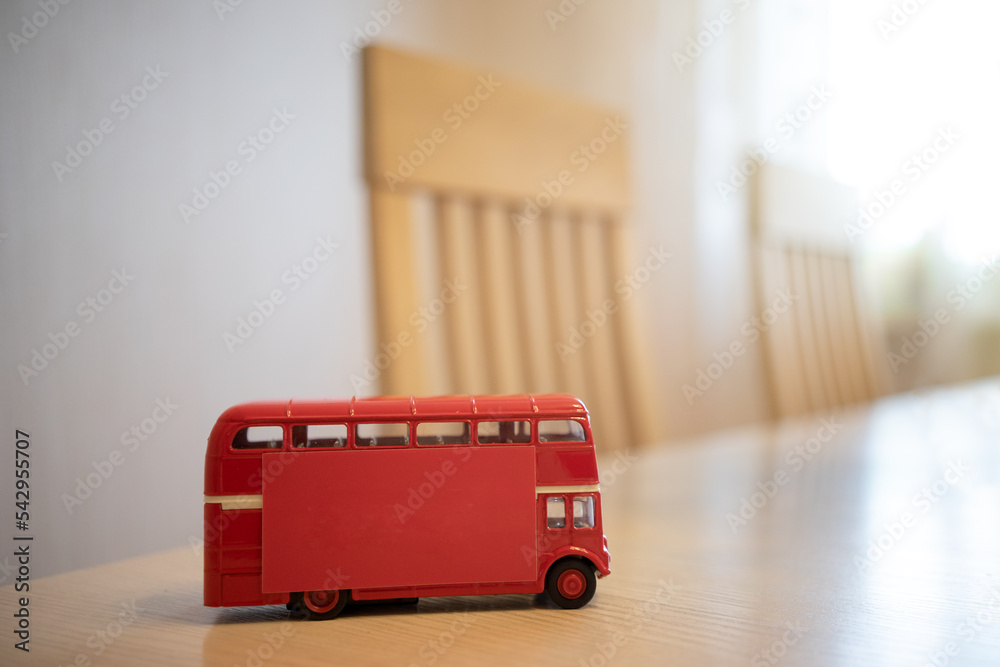 A red double-decker bus on the kitchen table. A bus with a red sticker on the side, a clean place for text. The interior of the furniture in the apartment. A table with chairs in the background.