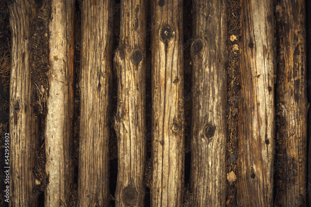 Wooden background made of pine.Photo of the texture of a pine log wall. A three-dimensional wall made of wood.
