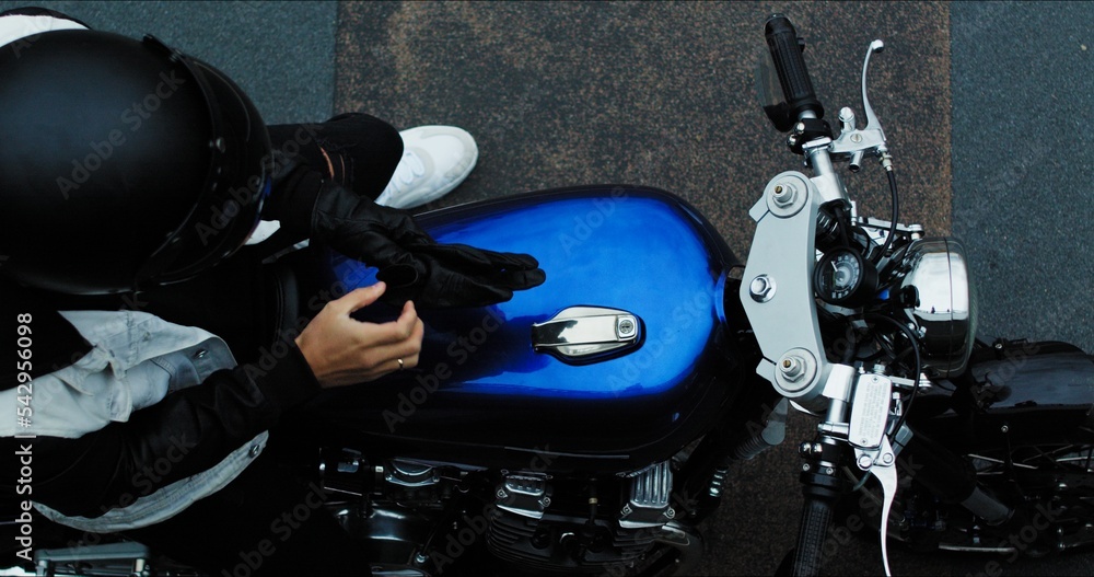 Man motorcycle rider takes black leather glove and puts on hand sitting on blue classic motorbike. Top view