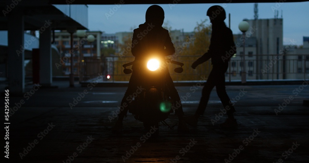 Silhouette of young male biker turning on a headlight of his motorcycle at night. Girl sits on a bike behind her boyfriend