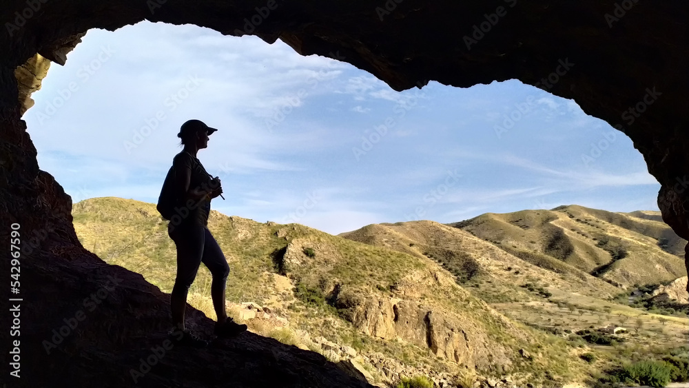 Soft focus silhouette of a woman in a cave on walk in nature.