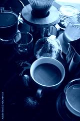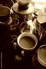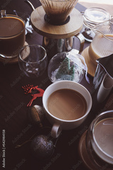 Christmas decorations and coffee making equipment on wooden table for holiday concept background