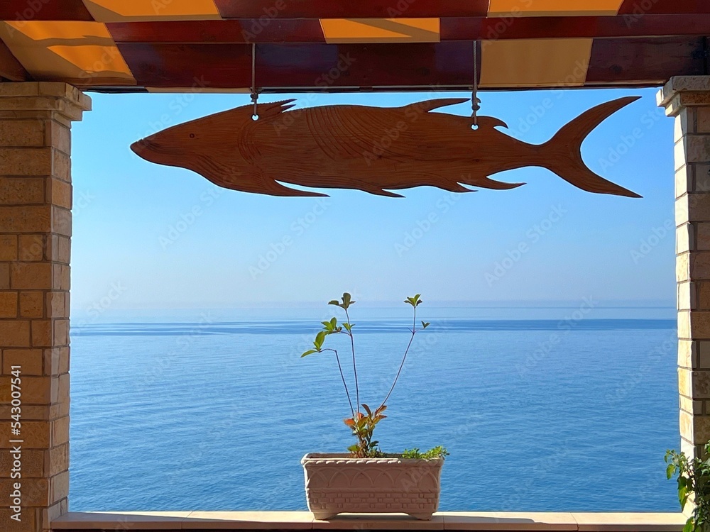 Scenic view from the window to the blue water in fish seafood restaurant.