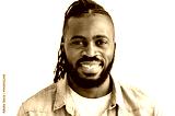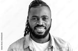 Close-up photo of an attractive black guy, african american man, with dark brown eyes, with dreadlocks, standing over isolated white background, looks at camera with candid pleasant smile