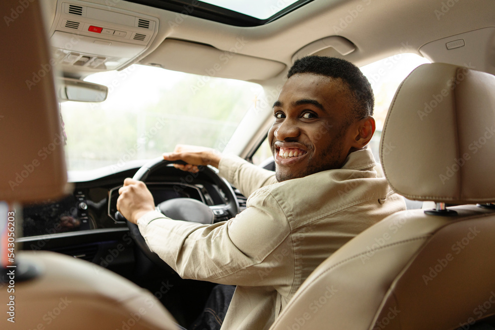 Back view shot of handsome african man sitting in car and holding steering wheel smiling happily at camera