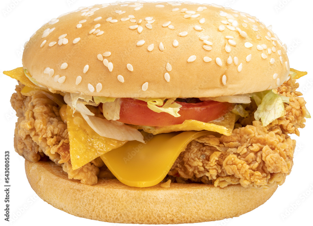Chicken Hamburger with cheese, tomato, onion, lettuce and ketchup mustard isolated on white background, Hamburger on white PNG file.