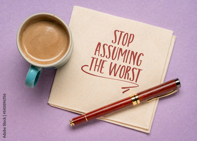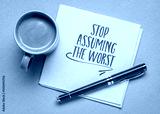 stop assuming the worst inspirational note or advice on a napkin with a cup of coffee, positive mindset concept