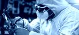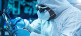 African-American scientist works in a modern scientific laboratory for the research and development of microelectronics and processors. Manufacturing worker uses computer technology and equipment.
