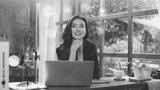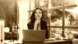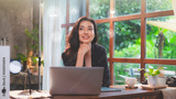 Businesswoman imagining or dreaming to achieve her career or life planning goal. Concept of woman power vision ability to successful. Having a motivation while working. Life mind growth and target.