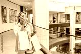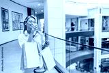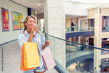 Beautiful young woman with shopping bags smiling and drinking a takeaway cup of coffee, indoors.