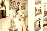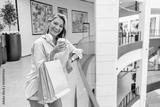Portrait of pretty smiling Caucasian woman with shopping bags and cup of coffee. Happy young beautiful woman drinking take away coffee and walking with bags after shopping in the Mall...