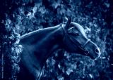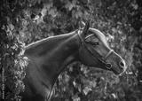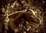 Portrait of a gorgeous red Arabian horse in a beautiful autumn forest. Equestrian photo painting