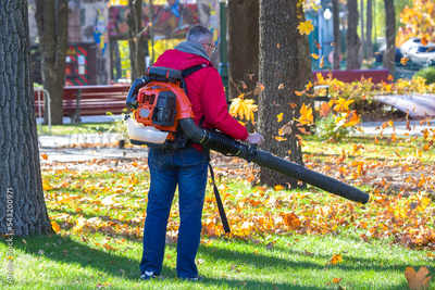 Working in the Park removes leaves with a blower. Park cleaning service. Removing fallen leaves in autumn.