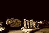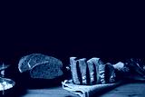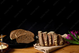 Decorated brown bread on wooden table. Dark composition. Copy Space. Bakery concept.