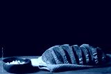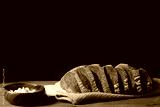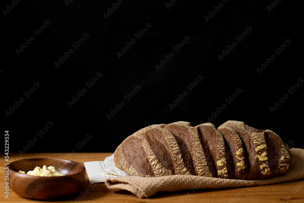 Brown bread on wooden table. Dark composition. Copy space. Bakery concept.