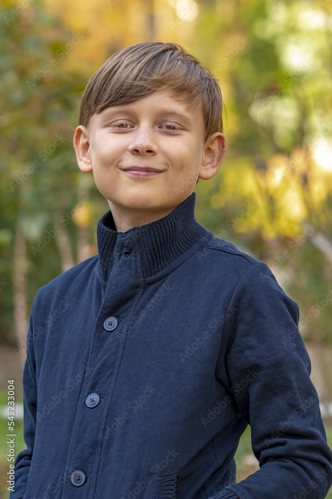 Street portrait of a happy 10-year-old boy on a blurry background of nature.